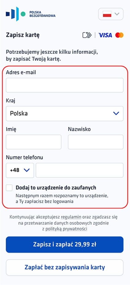 3. Wpisz e-mail i numer telefonu. Urządzenie, z którego dokonujesz zakupu możesz dodać do zaufanych - dzięki temu przy kolejnych zakupach Twoje urządzenie zostanie od razu rozpoznane i zapłacisz jednym kliknięciem.